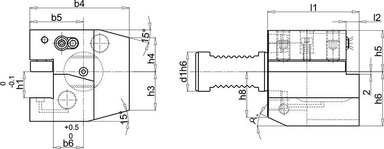 Applications : pour les porte-outils avec arrosage central, réduction possible de h1 au prochain porte-outils pour plaquettes réversibles plus petit avec plaquette d’appui.