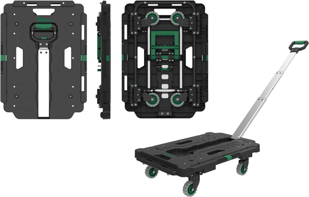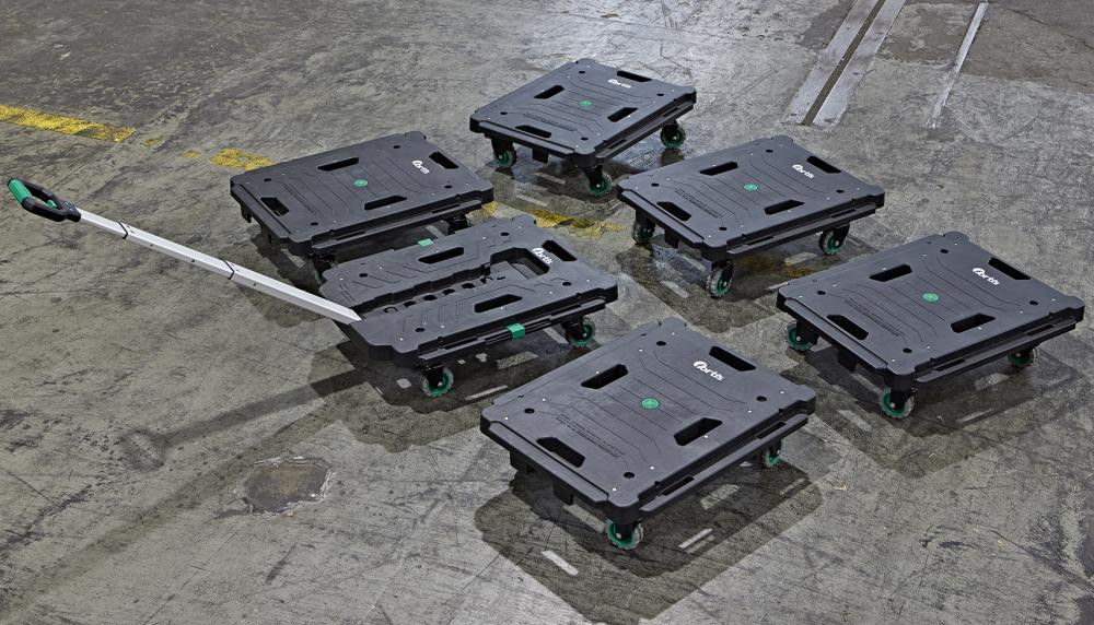 Modèle : unité de transport variable, extensible avec d'autres chariots multiusage pour former une grande plateforme. Roues pliantes et silencieuses.